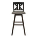 Creating a subtle rustic look for your dining space is the Amsonia Collection. A black sand-through finish graces the solid rubberwood 29-inch divided X-back swivel counter height chair, highlighting the veneer. 18 x 18 x 42.5H