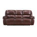 Comfort, style, and motion combine to create the Lyman Collection. The lay-flat reclining mechanisms of the sofa allows for complete body extension, perfect for an afternoon nap, movie night, or watching a big game. The transitional frame has hints of modern aesthetic with the sofa being covered by 100 percent top grain leather where the body touches, with faux leather covering the remaining areas, its brown hue providing complementing accent to your living room. 87 x 38.5 x 41H
