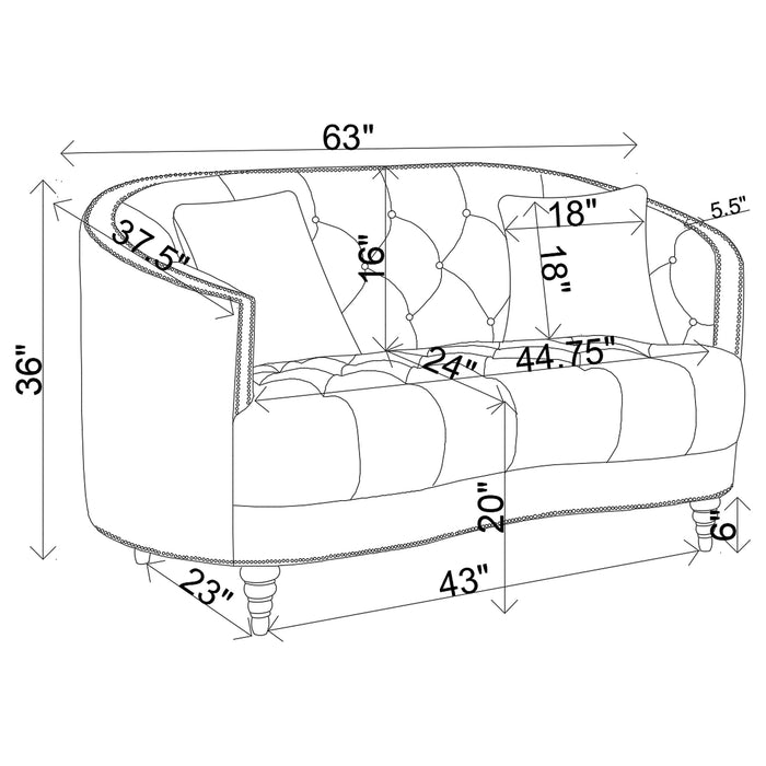 Classic and elegant, this two-piece living room set looks great with a chic aesthetic. Featuring high rolled and arms and button tufting, the traditional silhouettes of the sofa and loveseat emit an elegant aura. Perfect for a classic motif, the grey fabric upholstery adds texture to any space. A decorative nail head trim lines the cushions and subtle crystal details give this stunning piece all-over glam. Dress up any space with the smooth features and neutral hues.
